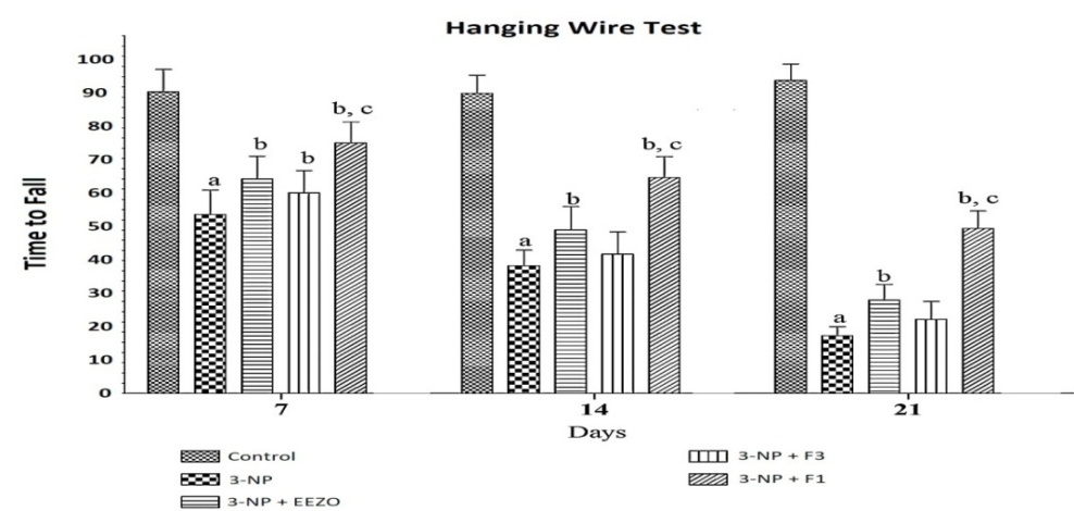 Administration of 3-NP significantly (P<0.001) decreased the time to fall by hampering the grip strength when compared to the normal control group animals [P<0.0001]. The F1 treatment groups and F3 treatment groups significantly (P<0.01 and P<0.05) increased the time to fall when compared to the 3-NP treatment and EEZO group of animals. This is shown in fig. 11.