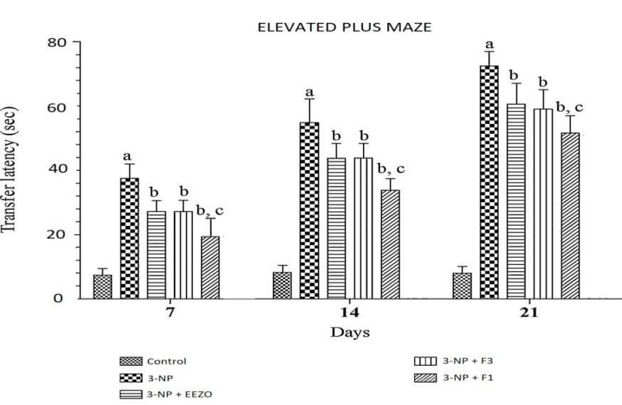 Animals treated with 3-NP alone treatment group showed a significant (P<0.001) increase in transfer latency by hampering spatial memory when compared to the normal control group animals [P<0.0001]. The F1 and F3 treatment groups ameliorated the spatial memory impairment significantly (P<0.01 and P<0.001) by decreasing the transfer latency when compared to 3-NP alone treatment group and EEZO group of animals. This is shown in fig. 12.