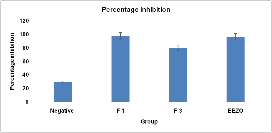 As catalase is an antioxidant enzyme which protects the brain from oxidative stress. The catalase level of brain homogenate was significantly (p<0.05) decreased in the negative control group (1.91±0.50µ moles/min/mg protein) as compared to the normal group (4.22±0.51µ moles/min/mg protein). The rats treated with F1 and F3 (10 mg/kg/p. o.) significantly elevated the catalase level values (3.14±1.28 and 2.89±1.04 µmoles/min/mg protein) when compared to the negative control. EEZO (10 mg/kg, p. o.) increased the catalase level (3.12±0.39µ moles/min/mg protein). The catalase level was increased in the formulation F1 (10 mg/kg) group when compared to all other groups (table 5).