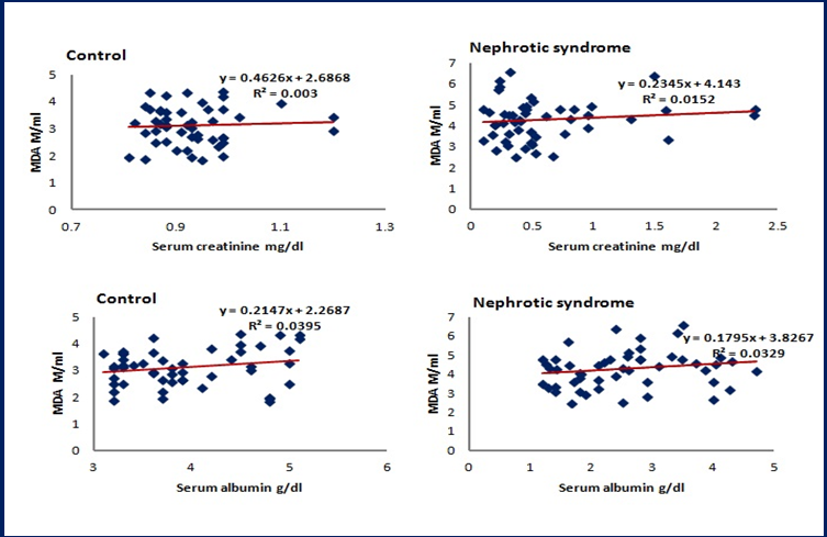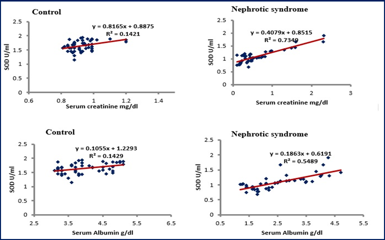 Our antioxidant and oxidant status results were well supported by a study done by the reddy's group in 2016. They found a significantly increased level of MDA and decreased the level of SOD activity and GSH in NS patients [8]. In contrast, another study found unaltered GSH concentrations and increased SOD concentration in children with NS [6, 17]. We observed a statistically significant positive association between serum creatinine and SOD activity and serum albumin and SOD activity (fig. 1). Similarly, Mistry et al. also reported a positive correlation of SOD activity in Diabetic nephropathy [32]. The earlier study found that SOD is a responsible and significant mediator of the podocyte damage, causing glomerular injury influenced by puromycin and involved in many other diseases [33]. As a result, SOD activity is one of the most potent stress markers in diagnosing renal disease, including NS. No significant correlations were found in MDA and GSH levels compared with serum albumin and serum creatinine (fig. 2,3).