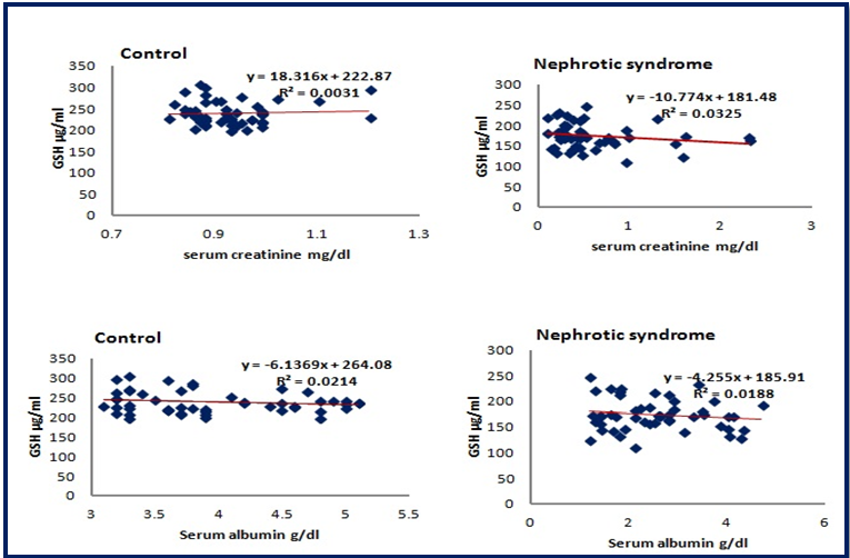 Fig. 2: Correlation of serum albumin, serum creatinine with GSH (glutathione) levels in the blood