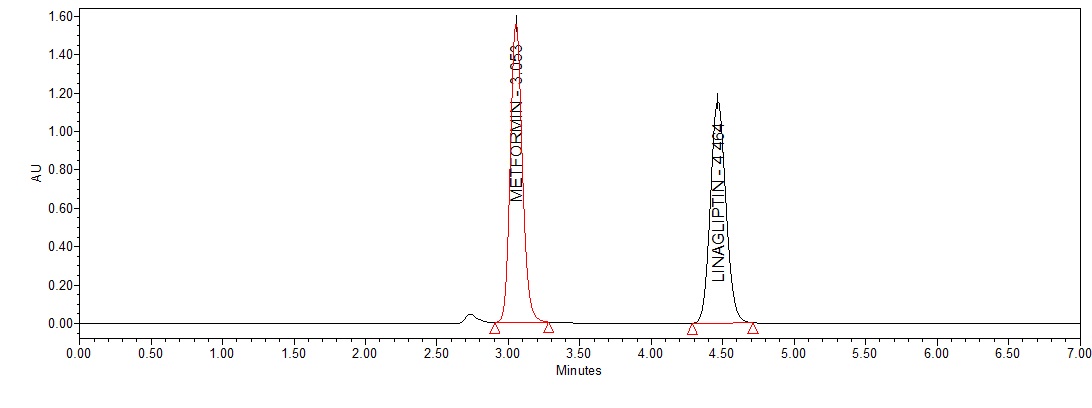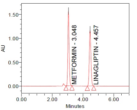 Accurately weighed standards of Metformin HCl (2000 mg) andLinagliptin (10 mg) were weighed accurately 2000mg of Metformin and 10 mg of Linagliptinwas transferred into 50 ml of volumetric flask dissolved and diluted to volume with the mobile phase and sonicated for 15 min. Pipette out 5 ml of this solution into 25 ml volumetric flasks and make up the volume with the mobile phase.