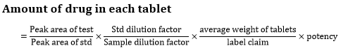 With the optimized chromatographic conditions, a steady baseline was recorded, the mixed standard solution was injected five times and the chromatograms were recorded. This procedure was repeated for the sample solution too. The averages of peak areas were determined for standard and sample solutions. The concentration of the drug was calculated using the following formula