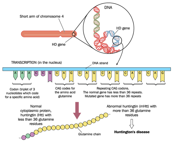 Fig. 1: Schematic demonstration of gene mutation causing Huntington’s disease [10]. 1. Cytosine, adenine, and guanine (CAG) trinucleotide repeats on the short arm of chromosome 4p16.3 in the Huntingtin (HTT) gene having less than 36 repeats. 2. Expansion of unstable trinucleotide repeats 36 and above on HTT gene causes huntington’s disease