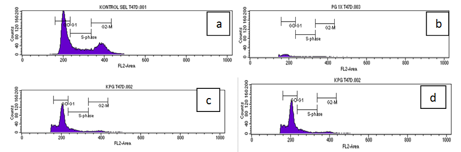 Fig. 1: Cell cycle analysis using flowcytometry. T47D cells were treated by doxorubicin, EAE, and theircombination for 24h and stained using propidium iodide. (a) control cells; (b) EAE 100 µg/ml; (c) doxorubicin 1 µg/ml; (d) combination of doxorubicin 0.125 µg/ml and EAE 12.5 µg/ml. Combination of EAE and doxorubicin exhibited G0/G1 phase and decreased T47D cell population