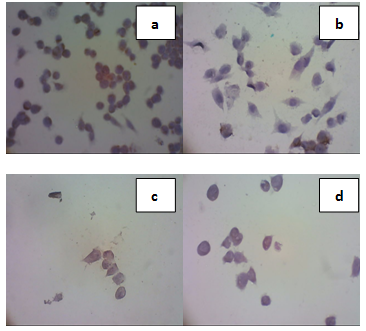 Fig. 3: Expression of cyclin D1 on T47D cells using immunocytochemistry. (a) control cells; (b) EAE 100 µg/ml; (c) doxorubicin 1 µg/ml; (d) combination of doxorubicin 0.125 µg/ml and EAE 12.5 µg/ml