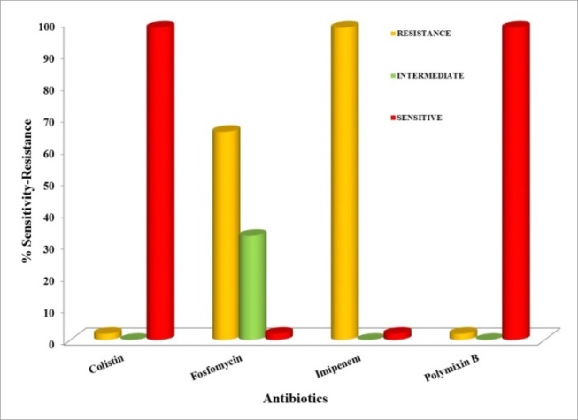 *Since the interpretive standards for Colistin, Fosfomycin and Polymixin B against Acinetobacter is not established in CLSI 2013mannual therefore Zone diameter interperative standards for Enterobacters and E. coli are used. (30)