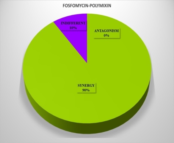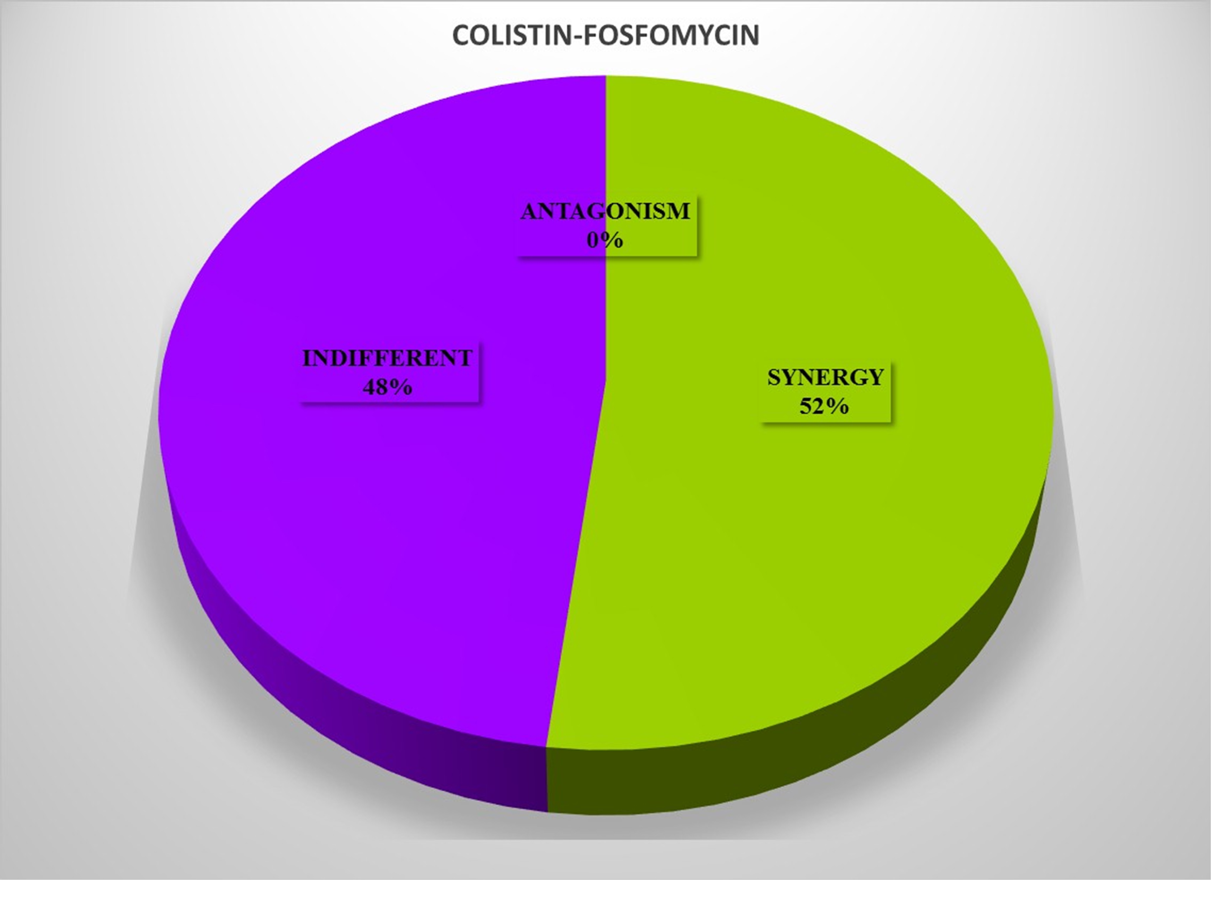 However, table 3 shows the susceptibility pattern of individual antibiotics against isolates from different site of infection. After investigating the effectiveness of the combination of same antimicrobial together the most useful and effective combination was Fosfomycin-Polymixin, which was successful in inhibiting more than 90% of multidrug resistant isolates as shown in table 5, fig. 2. It was also obvious from our efforts that the combination of Colistin-Fosfomycin was not as much effective compared to Fosfomycin-Polymixin but still over 50 % of isolates were susceptible (fig. 3). It is also indicated in fig. 4 that the least potent combination was Polymixin-Imipenem, It inhibited synergistically only 38.46% ofAcinetobacterspp. Moreover, it was observed that the tested combinations were highly effective against Acinetobacterisolates obtained from tracheal aspirate (table 6).