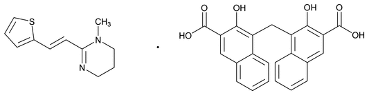 Pyrantel pamoate (C11H14N2S. C23H16O6)-(E)-1,4,5,6-Tetrahydro-1-methyl-2-[2-(2-thienyl)vinyl]pyrimidine 4,4'-methylenebis[3-hydroxy-2-naphthoate] (1:1) (CAS registry number: 22204-24-6) is yellow to tan solid. Soluble in dimethyl sulfoxide, slightly soluble in dimethyl formamide, practically insoluble in water and methanol [10].