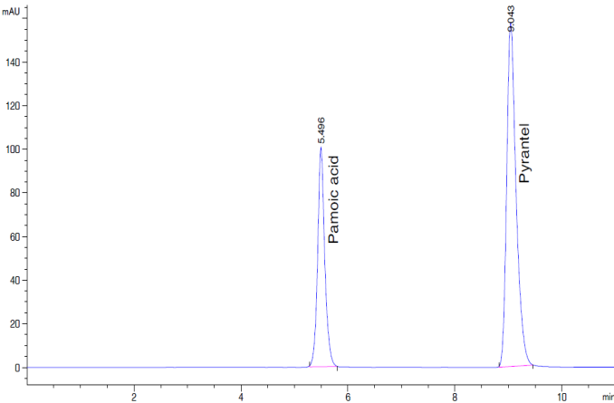 The system suitability parameters were measured to verify the chromatographic system performance. System suitability was checked by six replicate injections (n=6) of standard solution. Main parameters including: for pyrantel the RSD, % of peak areas (acceptance criteria:<2.0 %), the RSD, % of retention times (acceptance criteria:<1.0 %), the resolution between pamoic acid and pyrantel peaks (acceptance criteria:>8), the tailing factor (acceptance criteria:<1.3), the number of theoretical plates (acceptance criteria:>8000) and for mebendazole the RSD, % of peak areas (acceptance criteria:<2.0 %), the RSD, % of retention times (acceptance criteria:<1.0 %), the tailing factor (acceptance criteria: 0.8-1.3), the number of theoretical plates (acceptance criteria:>2000) were measured.
