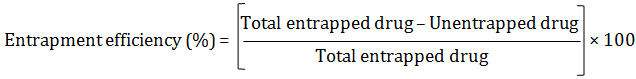 It is determined by weighing the equivalent amount of dried lyophilized preparation of loaded optimum formula and placed in 20 ml phosphate-buffered saline pH 7.4, followed by agitation in an incubator shaker (160 r/min) for 24 h at 37 °C. The solution filtered through what man filter 42 pore size and after suitable dilution drug solubilized was analyzed spectrophotometrically at λ max 207 nm, followed by application in pre-determined phosphate buffer calibration curve equation.