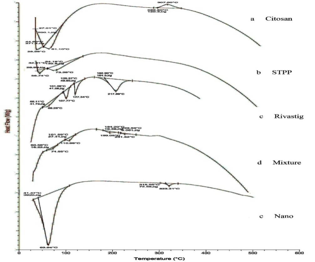 DSC interactions are typically ascertained as the elimination of endothermic peaks, appearance of recent peaks, the difference in peak height and its onset, peak temperature/melting points and relative peak area, or enthalpy. It likewise gives data regarding drug excipient compatibility and the development of a new substance. Thermal analysis was used in order to elucidate any interactions between rivastigmine, investigated polymer and the cross-linking agent. DSC was carried out using Shimadzu, DSC 60 thermal analyzer with a liquid nitrogen cooling accessory. The analysis was performed under purge of dry nitrogen gas (40 ml/min−1). A sample of 2–5 mg was placed in an aluminum crucible cell and was firmly crimped with the lid to provide an adequate seal. The samples were heated from ambient temperature to 400 °C at a preprogrammed heating rate of 10 °C/min−1. All samples were analyzed in the same manner i.e. pure powders, physical mixture or dry formulae.