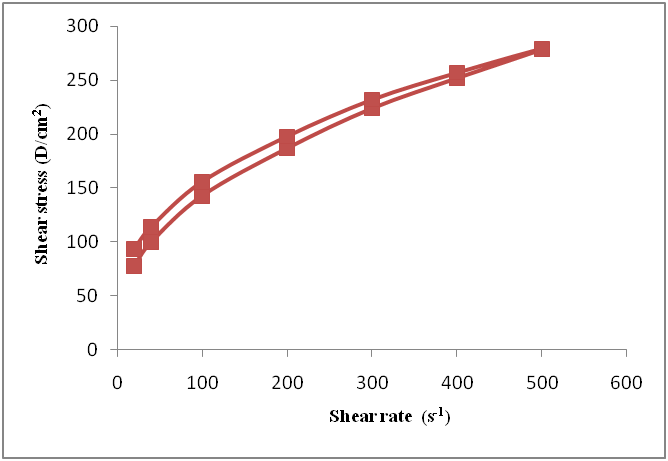 Where D is the shear rate (s-1), S is the shear stress (Pa), N is Farrow’s constant and ὴ is the viscosity (Pa. s). N is the slope of the plot of log D against log S, which indicates the deviation from Newtonian flow. When N is less than one, it indicates dilatant flow (shear rate thickening). If N is greater than one, it indicates pseudo plastic or plastic flow (shear rate thinning). When the system showed thixotropic behavior, the hysteresis area (H. A.) between the upward and a downward curve was measured, adopting the trapezoidal rule.