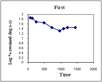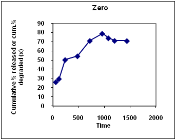 In order to know the mechanism of drug release from the CSNPs, the experimental release data were fitted on various release model commonly used to describe the release kinetics from nanoparticles such as First order, second order, Higuchi kinetic models, Hixson-Crowell kinetic models, diffusion and Baker model a pH 7.4 using multiple linear regression analysis (sigma plot 11 software). The release rate constant (K) and correlation coefficient (r2) close to unity was taken as order of release. The following models were fitted: log cumulative % drug remaining versus time (first-order kinetic model), log concentrations plot versus time is a straight line with k equal slope of the line (second-order kinetic model), cumulative % drug release versus square root of time (Higuchi model), cube root of the initial concentration minus cube root of percent remaining versus time (Hixson-Crowell models), the release rate constant k, corresponds to the slope and drug release studies were plotted as [d (Mt/M∞)]/dt with respect to the root of time inverse (Baker Lonsdale) [29].
