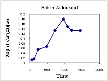The data of the release of the RS from the Nano gel were fitted to six kinetic models, which are described as shown in table 4. The result indicated that the release of the drug from the Nano gel followed the diffusion kinetic model, with the best fit value for the correlation coefficient (R2) at 0.9343 as shown in fig. 9. The rate of drug release from any solid or semi-solid delivery system is usually controlled by dissolution and/or diffusion. Regardless of mechanisms involved in the release, its rate under sink conditions can be expressed by a single general equation as follows: