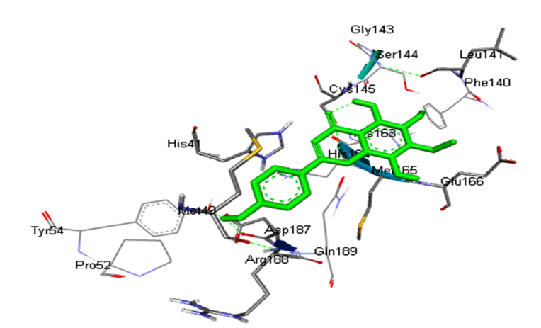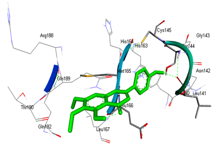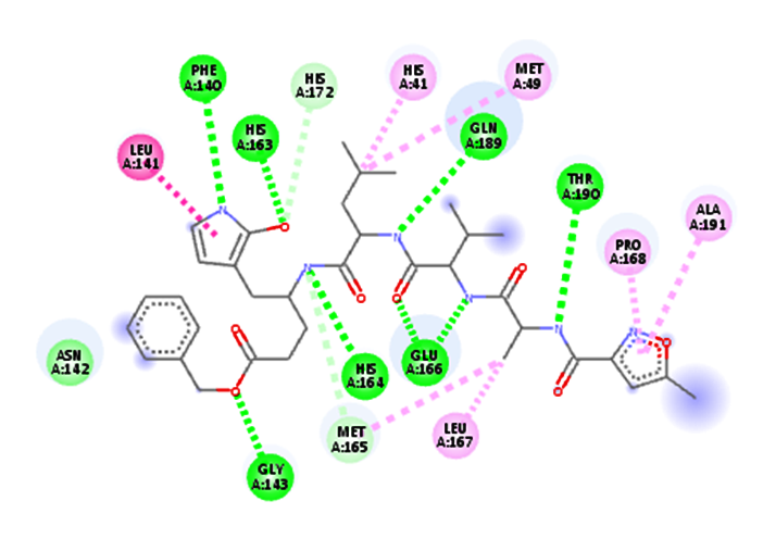 Conventional H-bond: Thr26:O: Acceptor-LIG1:H: Donor, H-bond Distance-2.51Å Phe140:O: Acceptor-LIG1:H: Donor, H-bond Distance-2.46Å His163:HE2:Donor-LIG1:O: Acceptor, H-bond Distance-1.97Å Glu166: O: Acceptor-LIG1:H: Donor, H-bond Distance-2.41Å Glu166: OE1:Acceptor-LIG1:H: Donor, H-bond Distance-2.03Å Glu166: OE2:Acceptor-LIG1:H: Donor, H-bond Distance-2.65Å Thr190:O: Acceptor-LIG1:H: Donor, H-bond Distance-2.08Å Van der vaals: Leu27, Leu141, Gly143, Ser144, His164, Leu167, Pro168, His172, Arg188, gln189, Ala191 Carbon-Hydrogen bond: Cys145, Met165 Pi-Pi T shaped: His41 |
