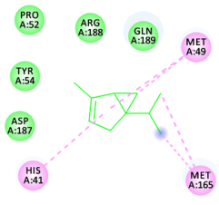Conventional H-bond: NIL Van der vaals: Pro52, Tyr54, Asp187, Arg188, Gln189 Pi-alkyl: His41, Met49, Met165 |