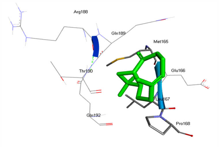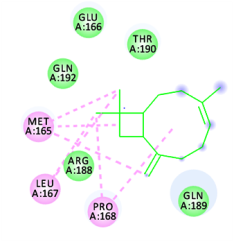 Conventional H-bond: NIL Van der vaals: Glu166, Arg188, Gln189, Thr190, Gln192 Pi-alkyl: Met165, Leu167, Pro168 |