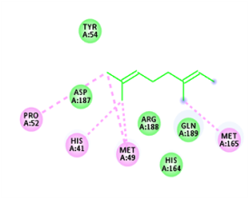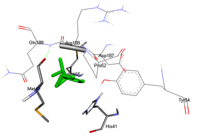 Conventional H-bond: NIL Van der vaals: Tyr54, His164, Asp187, Arg188, Gln189 Pi-alkyl: His41, Met49, Met165 |