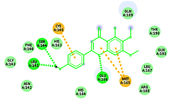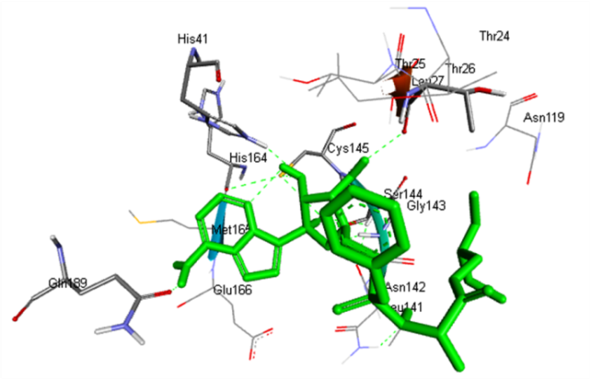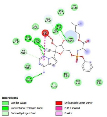 Conventional H-bond: Thr26:O: Acceptor-LIG1:H: Donor, H-bond Distance-2.12Å Cys145:HN: Donor-LIG1:N: Acceptor, H-bond Distance-2.25 Å Cys145:SG: Donor-LIG1:N: Acceptor, H-bond Distance-3.45 Å Ser144:HN: Donor-LIG1:H: Acceptor, H-bond distance-2.45Å Van der vaals: THr24, Thr25, Met49, Thr118, Asn119, Leu141, Asn142, His163, Met165, Glu166 Carbon-Hydrogen bond: Gly143, His164 |