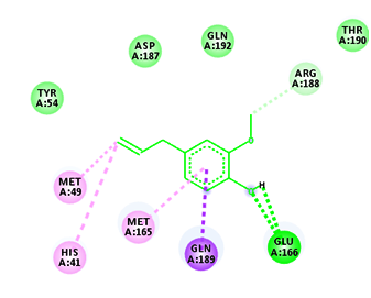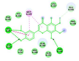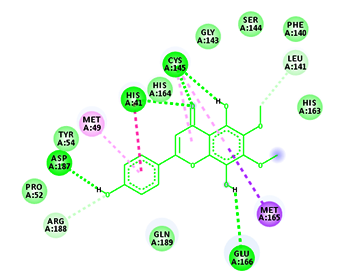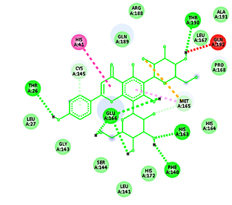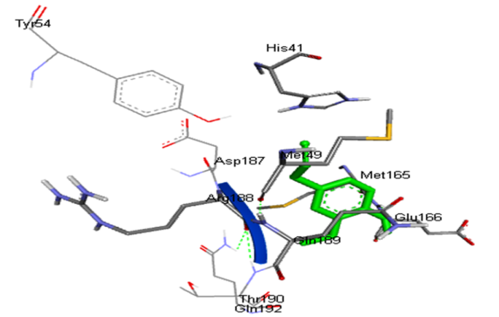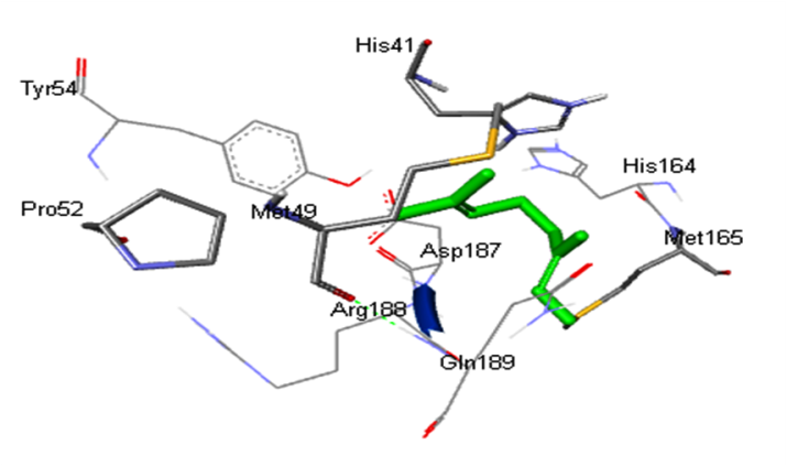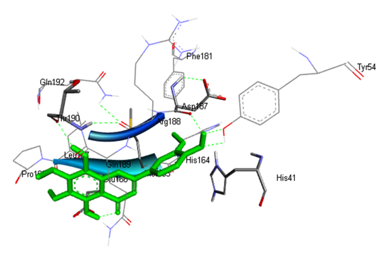 Conventional H-bond: His41:HD1: Donor-LIG1:O: Acceptor, H-bond Distance-2.69Å His41:HD1: Donor-LIG1:O: Acceptor, H-bond Distance-2.81Å Asp187:O: Acceptor-LIG1:H: Donor, H-bond Distance-1.90Å Thr190:O: Acceptor-LIG1:H: Donor, H-bond Distance-2.12Å Van der vaals: Tyr54, His164, Leu167, Pro168, Phe181, Arg188, Gln192 Carbon-Hydrogen bond: Glu166, Gln189 Pi-Pi stacked: His41 Pi-alkyl: Met165 |