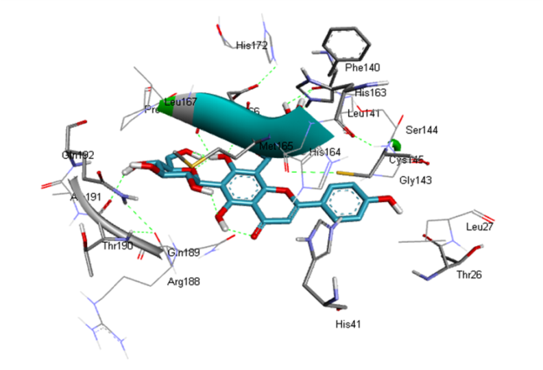 Data obtained by molecular docking study is arranged as tabulated form (table 1). Table 1 shows the 2d interactions of ligands with target enzymes and necessary hydrogen bond formation by ligands with targets required for inhibition of target enzyme of covid-19. Whatever investigational ligands have been included in the study are found in the different extracts of Ocimum sanctum Linn. plant. Fig. 1 indicates the active site of target to confirm the binding site of investigational ligands if they were interacted with the amino acids in the active site of target or found to be attached any other site inside the target. The active site of this target enzyme comprises of HIS41, MET 49, PHE140, LUE141, ASN142, GLY143, HIS163, HIS164, MET165, GLU166, LEU167, PRO168, HIS172, GLN189, THR190, ALA191 (fig. 1). As well superimposition is also performed using discovery studio to check the actual position of compounds after molecular docking study onto target enzyme (fig. 2 and 3). The best poses of natural ligands and enzyme complexes are described [fig. 4(A-I)]. Being a chymotrypsin-like cysteine protease in nature, main protease enzyme Mpro executes a vital role in provoking replication and transcription of virus [16]. Therefore we opted for this enzyme as a prime target for molecular docking study to identify promising inhibitors of this deadly virus. Results indicated that Vicenin might be promising in case of inhibition of the main protease enzyme. Rationales for being an inhibitor, are that chemical compounds have to show some specific binding interactions with amino acids in active sites (active pocket) of target enzyme. Also these interactions should be compared with native ligand attached with enzyme as downloaded (pdb). Interactions of the native ligand with enzyme revealed that proper inhibition of main protease enzyme requires the formation of hydrogen bonds with specific amino acids residues such as Phe140, Gly143, His163, His164, Glu166, Gln189, Thr190, If any investigational compound able to interact by forming Hydrogen bond with all or some of above-mentioned amino acid residues then possibly that particular compound or some of the compounds included in this study might be potent inhibitor of target enzyme. After the superimposition, it was also found that all investigational ligands can bind to the target enzyme at the same position (fig. 2). In current study, three compounds such as α-Thujene, Myrcene could not afford requisite hydrogen bond formations with target enzyme as well as exhibited very low binding energy i.e.-4.820,-4.28kcal/mol respectively. Also, Caryophyllenee could not afford the hydrogen bond formation but exhibited better binding affinity (-6.46kcal/mol) compared to α-Thujene, and Myrcene. Cirsimaritin showed moderate binding energy (-6.61kcal/mol) and was able to form three hydrogen bonds with amino acid residues Leu141, Ser144, and Glu166 (with hydrogen bonds distance 2.01Å, 2.22Å, and 1.83Å, respectively) but only interaction with Glu166 might be required for inhibition of enzyme, remaining other two H-bonds formation were not mandatory for enzyme inhibition. Eugenol demonstrated very less binding energy (-4.5 kal/mol) and made two hydrogen bond with Glu166 (with hydrogen bonds distance 2.11Å and 2.31Å). Isothymonin and Isothymusin both exhibited moderate binding energies (-5.92 and-6.23 kcal/mol, respectively) and could afford only one mandatory h-bond formation with Thr190 andGlu166 respectively (with hydrogen bonds distance 2.12Å and 3.08Å respectively), whereas other h-bonds were common in both. For comparative purposes, Remdesivir was included in the study but it showed very least binding affinity (-3.7 6kcal/mol), although it could interact with target enzyme in the active pocket. Vicenin proved itself most efficacious compound among other investigational compounds because of having the highest binding affinity (-7.02) and by forming hydrogen bonds with amino acid residues i.e. Thr26, Phe140, His163, Glu166, and Thr190, most of them were supposed to be mandatory of inhibition of target enzyme. For the symptomatic treatment of covid-19 and its different variants, some allopathic medicines were employed, such as hydroxychloroquine (Antimalarial drug), Remdesivir (Antiviral), Dexamethasone (Steroid) and other antioxidants. Shree et al., 2020 also emphasized the importance of herbal medicines to combat against covid-19 and concluded that Vicenin exhibited significant binding affinity as compared to the native ligand and could interrupt the interactions of covid-19 with host cell without producing any toxicity [17].