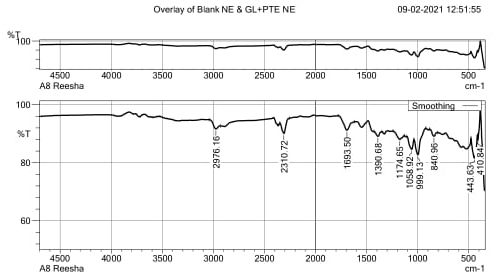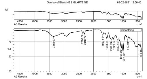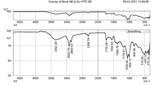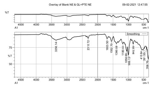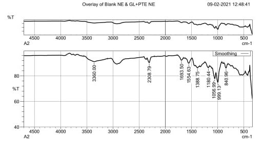 Compatibility of Amphotericin B with excipients was confirmed by FTIR studies. The FTIR study was conducted using potassium bromide (KBr) disc (pellet) method. FT-IR (IR Affinity S1, Shimadzu, Kyoto, Japan) was used to analyze pure drug Amphotericin B, Cholesterol, Soya lecithin, non-ionic surfactants (Span 40, Span 60, Span 80), carbopol, and their physical mixture in the same amount.