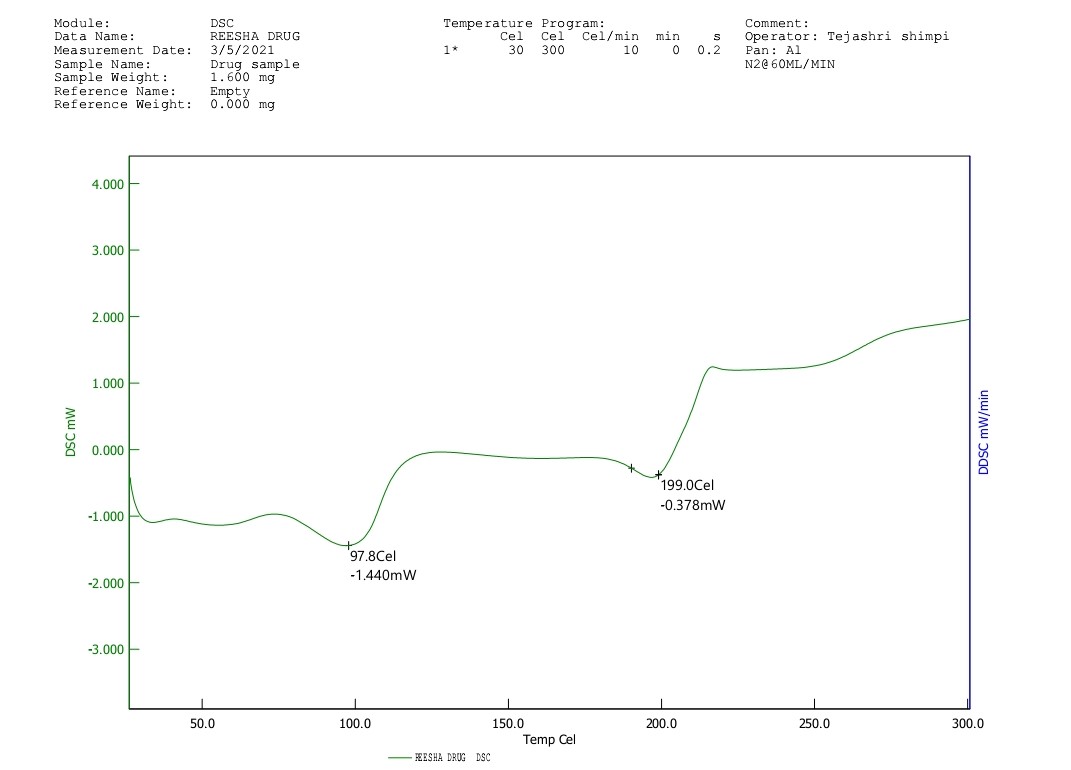 The Differential Scanning Calorimetry (DSC) thermogram of Amp B drug was analyzed using Differential Scanning Calorimetry equipped with a computerized data station. The sample was weighed and heated in a closed pierced aluminium pan at a heating rate of 10 °C/min between 30 °C and 300 °C with a nitrogen flow rate of 25 ml/min. It illustrates the interaction of various materials at various temperatures. It also allows studying the possible degradation pathways of the materials. It gives an idea of the physical and chemical interactions between the drugs.