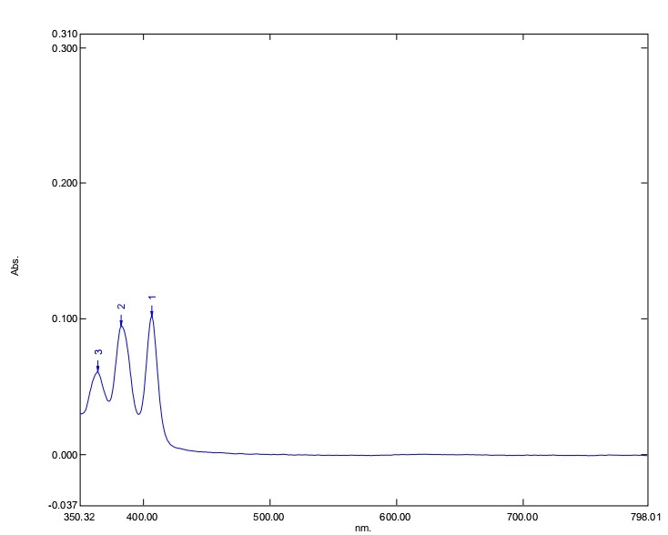 A stock solution of the drug was prepared using phosphate buffer solution (PBS) at pH 7.4 to give concentration of 100 ppm. 1 ml of the above solution was diluted up to 10 ml in a volumetric flask to give concentration of 10 ppm. Wavelength was adjusted from 800-200 nm to find the absorbance maxima.