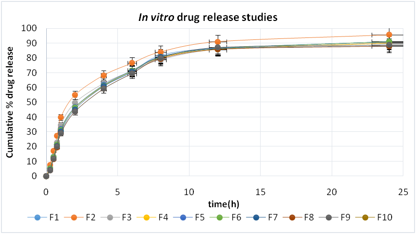 The in vitro release study of Amp B was conducted in phosphate buffer pH 7.4 for release studies through a dialysis bag of Amphotericin B proniosomal gel. This medium throughout maintained sink conditions, and thus release studies were performed. The drug release pattern for 24 h is depicted in fig. 13. The release profile indicated a biphasic release of Amp B from the proniosomes. Given in the table no. 5, in the first phase (6 h), there was an initial rapid release of about 69.48%±0.11-76.58%±0.33 according to the formulation, followed by a slow phase from 6 h to 24 h where about 20% was released. The results showed no lag time which causes a burst in drug release during the first 15 min (about 4–7%) of the encapsulated drug in the proniosomes. The highest drug release within 24 h was obtained with F2 (95.72%±0.30), while the lowest was F8 (88.006%±0.04).