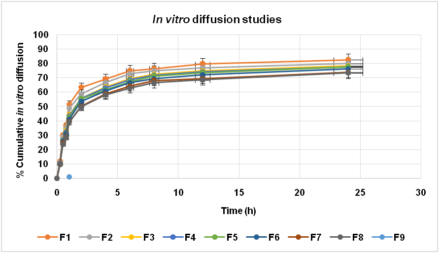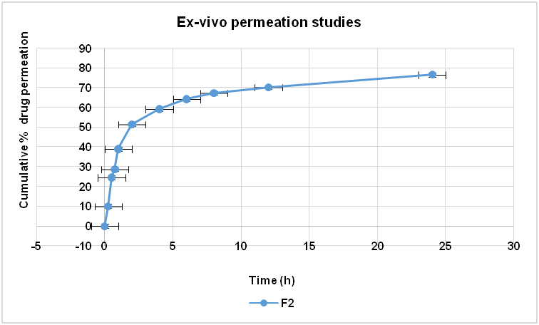 Drug release from F1 to F9 was found to be in the range of 88.006%±0.04 to 95.72%±0.05. The formulation F2 was selected as an optimized formulation based on these in vitro release studies, which showed satisfactory drug release rate of 95.72%±0.05 in 24 h. The selected optimized formulation F2 was used further for the evaluation of ex vivo permeation studies through goat skin [41].