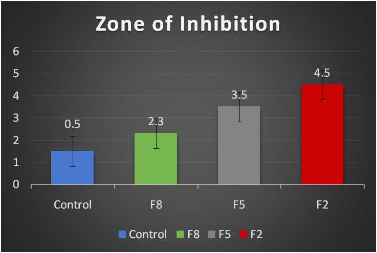 The antifungal activity of Amp B from its different gel formulae compared with control revealed in fig. 16. The antifungal activity was determined by measuring the inhibition zone. The results observed with F2 were greater where the inhibition zone reaches 4.5 cm, while the lowest activity was seen with F8 where the inhibition was 2.3 cm. This indicates good correlation between the chosen dissolution model and the in vitro antimicrobial susceptibility testing. The obtained results showed that the developed proniosomal gel was more efficient when compared to the control. Fig. 17 shows a comparison between the mean values of inhibition zones of Amp B proniosome gel F2, F5, F8 and control after 48 h. Results indicate that F2 exhibits maximum antifungal activity after 48 h [44].