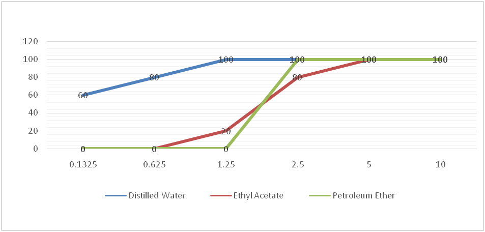 The LC50 values of Musa paradisiaca ripe fruit peel extracts of petroleum ether, ethyl acetate, and distilled water against Anopheles stephensi were 3.20, 61.2, and 14.58 mg/ml, while those of unripe fruit peel extracts were 59.82, 59.82, and 14.93 mg/ml respectively (table 1). An almost similar result in LC 50 and LC 90 values were observed in the unripe peel extracts of petroleum ether and ethyl acetate. On comparing the LC50 and LC90 values of both ripe peel extracts, ethyl acetate extract shows the highest mortality percentage. Distilled water extracts of ripe and unripe peel similar results are observed.