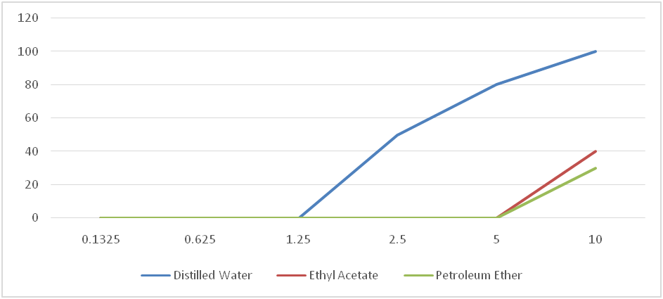 The larvicidal bioassay was assessed by the WHO standard protocol [17] with slight modifications. For bioassay test, the larvae were taken in five batches of twenty in 250 ml of water with the desired plant extract concentration (10 mg/ml, 5 mg/ml, 2.5 mg/ml, 1.25 mg/ml, 0.625 and 0.3125 mg/ml). Polysorbate 80 (Qualigens) is used as an emulsifier at a concentration of 0.05% in the final test solution. The control was set up with acetone, dechlorinated tap water, and polysorbate 80. All the experiments were conducted in triplicate and control was performed at parallel conditions for each series of experiments. No food was provided for the larvae. Larvae were considered dead if they were unarousable within a period, even when gently probed. Larval mortality was recorded after every 3 h of the exposure until 24 h and their mortality rate was evaluated [18].