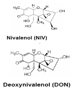 Fusarium species are the major concern due to their wide spread infestation of food grains [8, 9] and elaboration of variety of trichothecene mycotoxins [10]. The trichothecene producing Fusarium culmorum, F. graminearum, F. poae and F. sporotrichioides are most common contaminants of food grains [11]. F. graminearum and F. culmorum are the main producers of potent DON and NIV (Chemical structure) which are known to be carcinogenic, genotoxic, immunosuppressive, teratogenic and inhibit protein synthesis. F. aethiopicum is indistinguishable morphologically from F. graminearum [12].