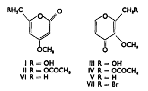 | 10 | 8.389 | 4H-Pyran-4-one, 5-(acetyloxy)-2(acetyloxy)methyl) | C10H10O6 | 226 | 1.9607 |