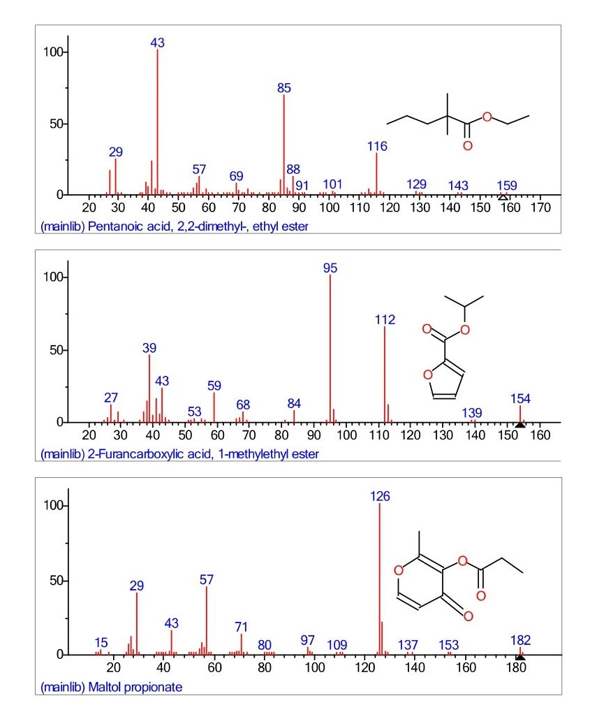 Fig. 3: 3(a), (b), (c): Mass spectrum of pentanoic acid, 2,2-dimethyl-ethy ester (3a), 2-Furancarboxylic acid, 1-methylethyl ester (3b), Maltol propionate (3c) [12]