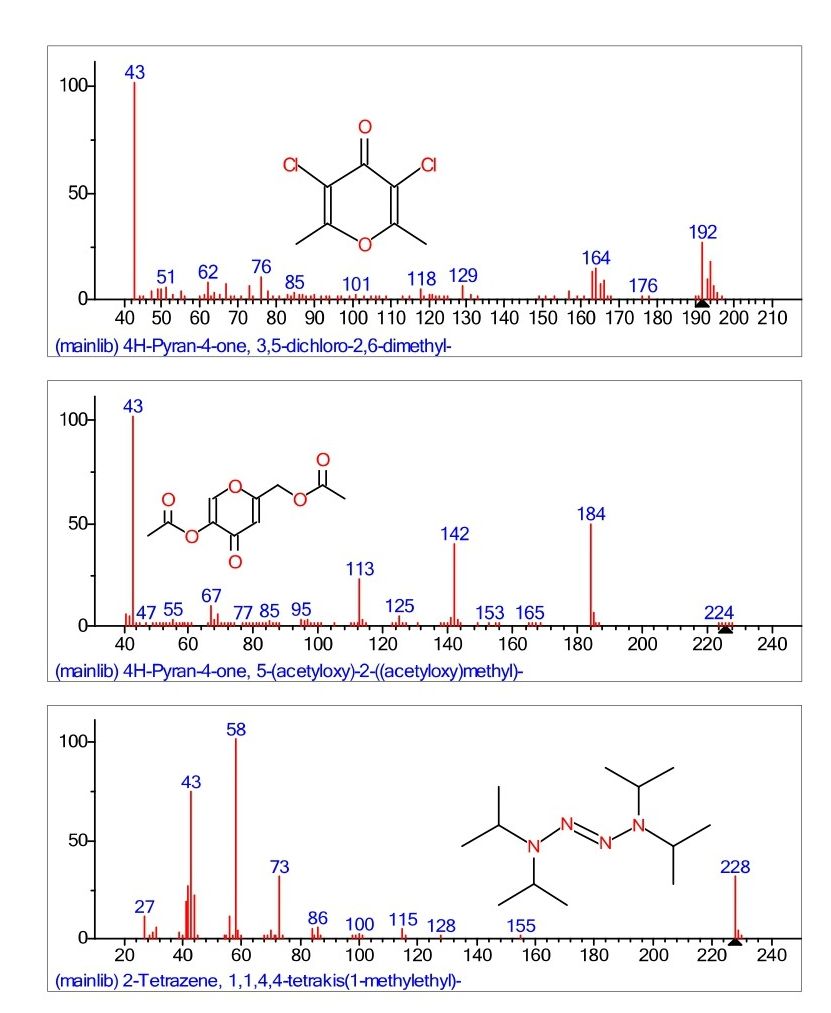 Fig. 4: 4(a), (b), (c): Mass spectrum of 4H-Pyran-4-one, 3,5-dichloro-2,6-dimethyl (4a), 4H-Pyran-4-one, 5-(acetyloxy)-2-((acetyloxy)methyl)-(4b), 2-Tetrazene, 1,1,4,4-tetrakis(1-methyethyl)-(4c)
