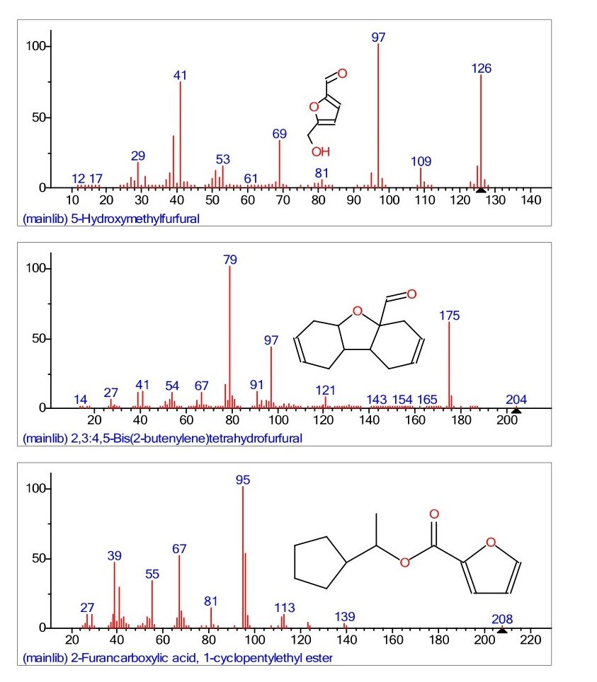 Fig. 5: 5(a), (b), (c): Mass spectrum of 5-Hydroxymethylfurfural (5a), 2,3;4,5-Bis(2-butenylene) tetrahydrofurfural (5b), 2-Furancarboxylic acid, 1-cyclopentylethyl ester(5c) [12]