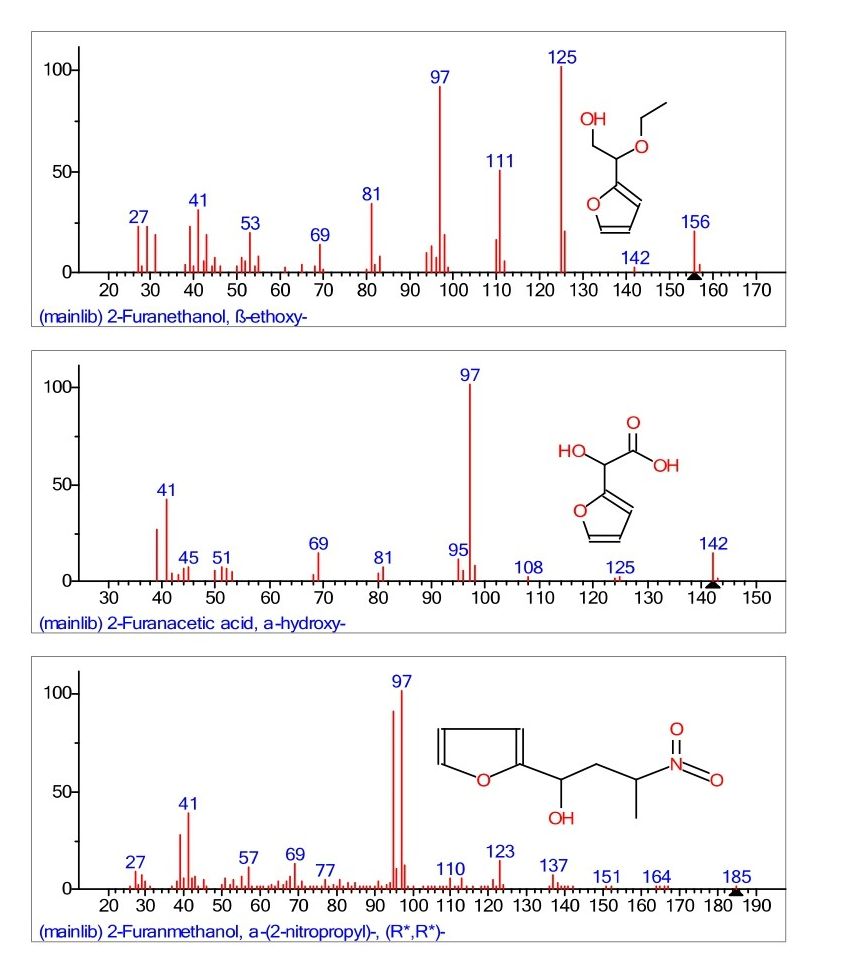 Fig. 6: 6(a), (b), (c): Mass spectrum of 2-Furanethanol, β-ethoxy-(6a), 2-Furanacetic acid, α-hydroxy-(6b), 2-Furanmethanol, α-(2-nitropropyl)-,(R*,R*) (6c) [12]