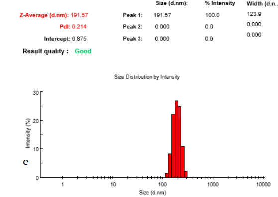 Fig. 1: Particle size and PDI of nanoparticles suspensions a) F1 b) F4 c) F7 d) F8 e) F9