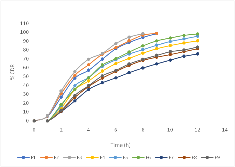 The cumulative % drug release of F4, F5, F6, F7, F8 and F9 at 12 h were 90.1%, 95.4%, 98.2%, 75.3%, 81.2% and 83.4% respectively.
