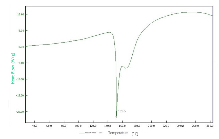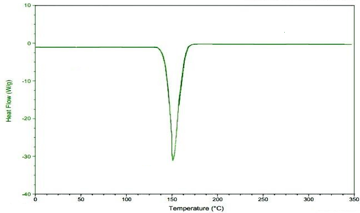 The DSC thermogram of the pure drug showed a sharp endothermic peak at 151.6 ℃, corresponding to its melting point. The DSC thermogram of the optimized formulation shows a sharp peak at 150℃. This suggests that the characteristics of the drug were not lost due to the formulation of nanoparticles. It also suggested the absence of any drug-polymer interactions, which might have resulted in the degradation of the drug.