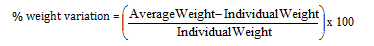 The test was carried out by using an electronic balance on twenty randomly selected tablets. All the tablets were weighed and the average weight of the tablets was compared with the weight of individual tablet [3, 17].