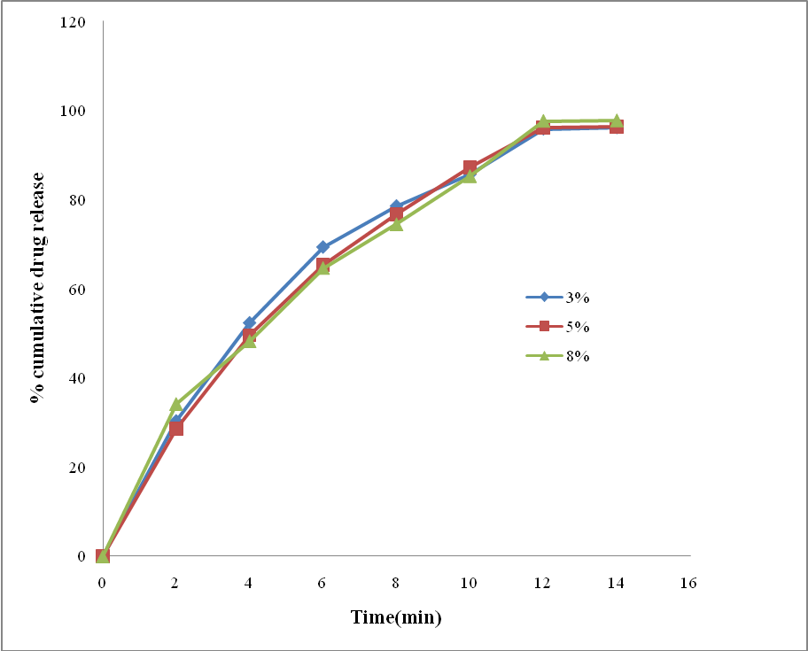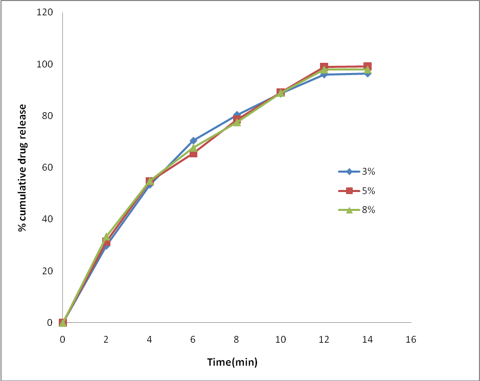 The results of previously reported work by Hemalatha et al. [9], using natural superdisintegrants, showed erratic disintegration time and dissolution profile irrespective of the concentrations where, as in this work, the disintegration time decreased and the percentage of drug release increased with respect to increase in concentrations of superdisintegrants of each category.