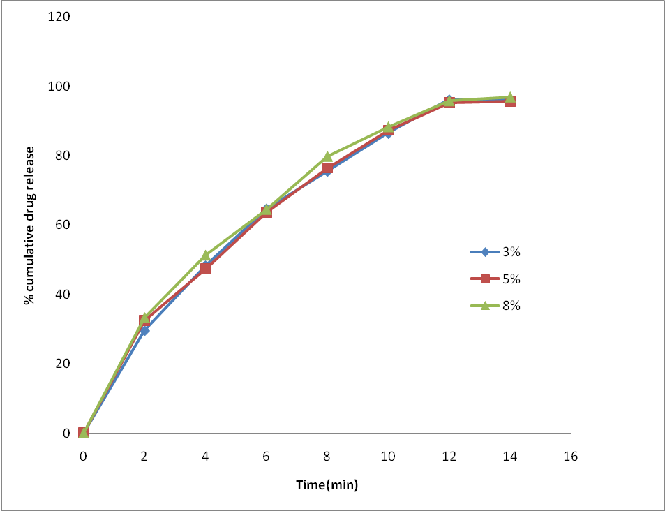 Fig. 3: In vitro dissolution profile of tramadol hcl tablets formulated with different concentrations of croscarmellose