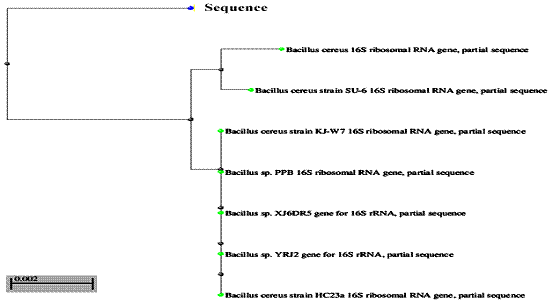 BLAST program was used to compare the 16s rDNA sequence of the isolate with the database sequences to obtain the sequences that displayed maximum similarity with that of the query. All the sequences reported by BLAST revealed that the isolate showed high percentage of similarity (95%) with the sequence of Bacillus cereus with a reasonably high score and e-value being zero. The 16s rDNA sequence and the phylogenetic tree that was constructed for these possible homologs using neighbor joining method are showed in fig. 1.