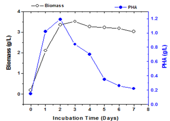 The bacterial growth and PHA production by Bacillus cereus was followed simultaneously and the results are given in fig. 2. The bacterial growth and PHA production by Bacillus cereus were followed simultaneously and the results are given in fig. 2. Growth as well as PHA production increased up to 48 h of incubation reaching a maximum of 3.4 g l-1 and 1.19 g l-1 respectively after which they started to decrease.
