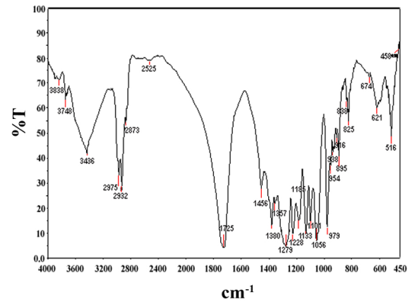 FTIR: The sample in chloroform was applied as a smear over the NaCl block and was analyzed using Perkin Elmer RX1 FTIR spectrophotometer. The FTIR spectrum of the sample was obtained at the wavelength in the range of 450-4000 cm-1.