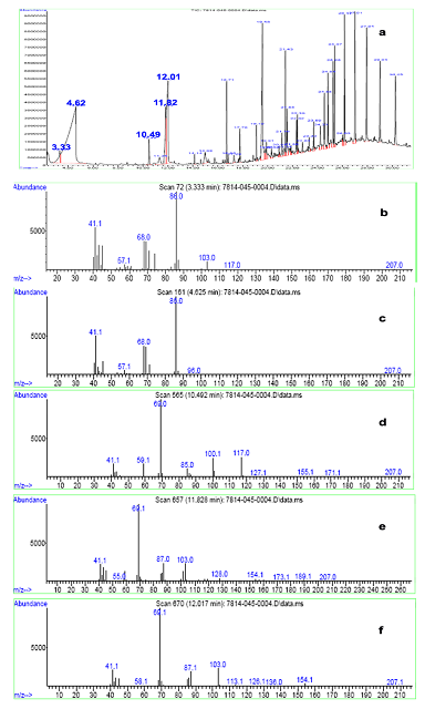 Fig. 4: GC-Mass Spectra of PHB produced by Bacillus cereus (a) Gas chromatogram and mass spectra for the peak corresponding to RT value of (b) 3.33 min (c) 4.63 min (d) 10.49 min (e) 11.83 min and (f) 12.02 min